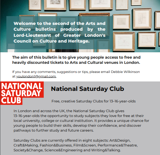 The Lord-Lieutenant of Greater London’s Council on Culture and Heritage has compiled edition 2 of an Arts and Culture bulletin designed to encourage young people and youth groups to access free and heavily discounted tickets to Arts and Cultural venues in London. This new edition features information on free art galleries, free opportunities to learn